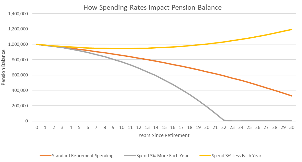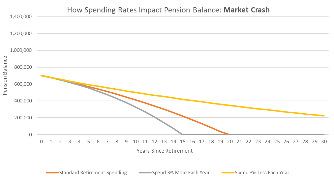 Figure 2: How spending rates impact pension balance in a market crash scenario